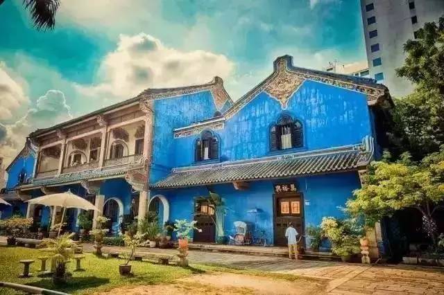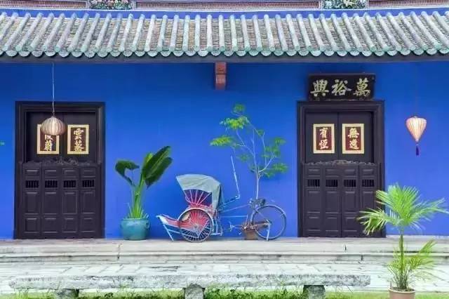 這棟古宅是檳城裡美得最驚豔的房子,寶藍色的石牆洋樓,精湛工藝的木窗木門,室內充滿中國元素的太師椅,帶有西洋風調的行李箱,奢華大氣。