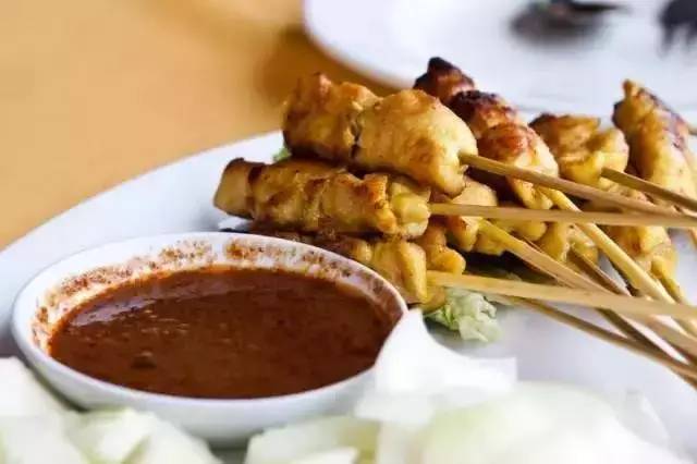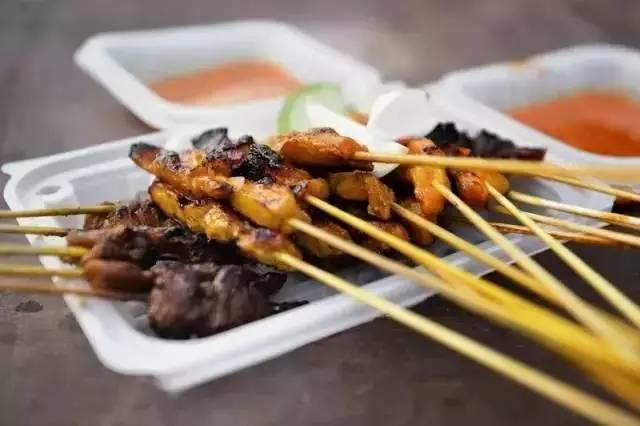 將醃製好的牛肉、雞肉、羊肉在炭火上烤,配上甜中帶辣的花生醬汁,再加上黃瓜、洋蔥和Ketupat(馬來飯糰)一起食用,絕對是難以忘懷的味道!